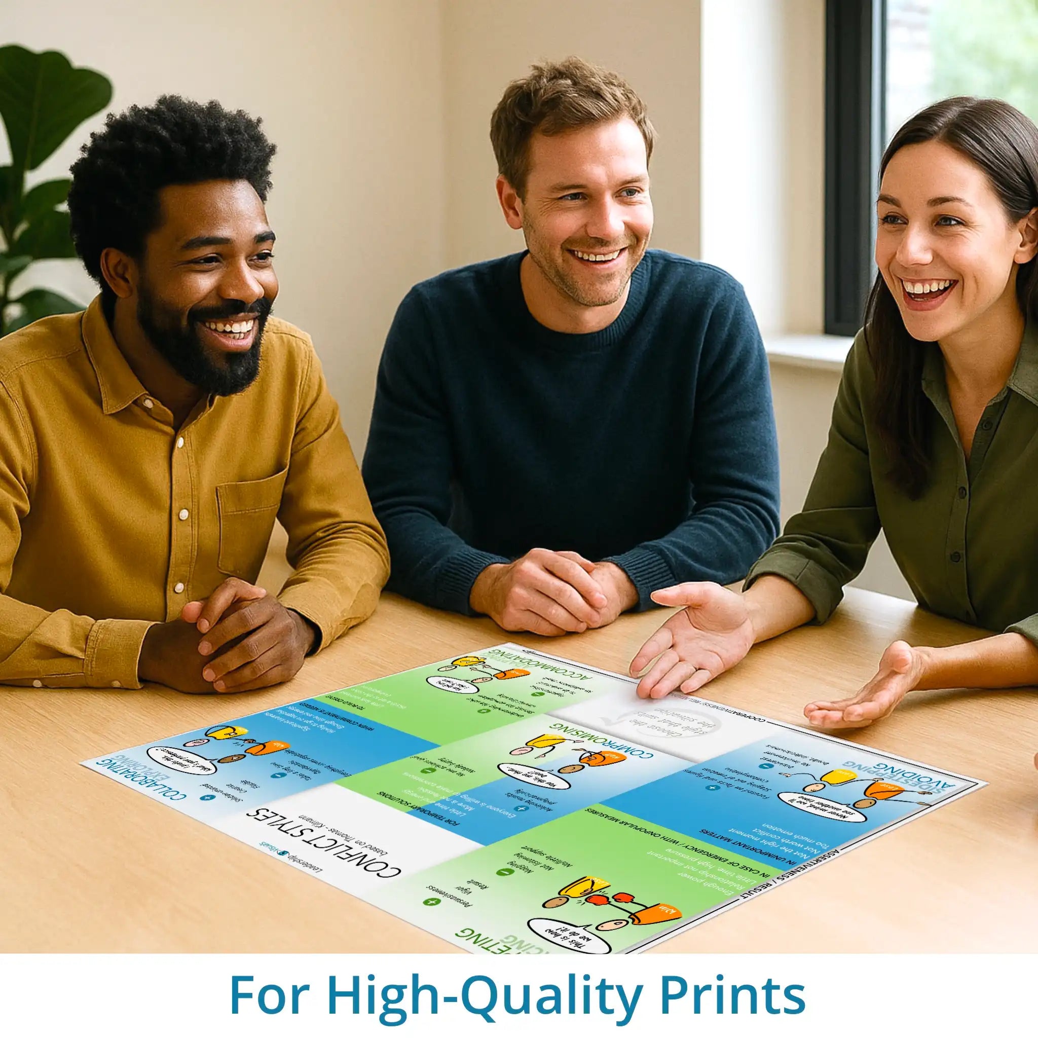 The Thomas-Kilmann model of conflict styles shown in a clear visual. Use it in leadership, team, or negotiation workshops to explore reactions in conflict situations. Helps participants choose constructive approaches.